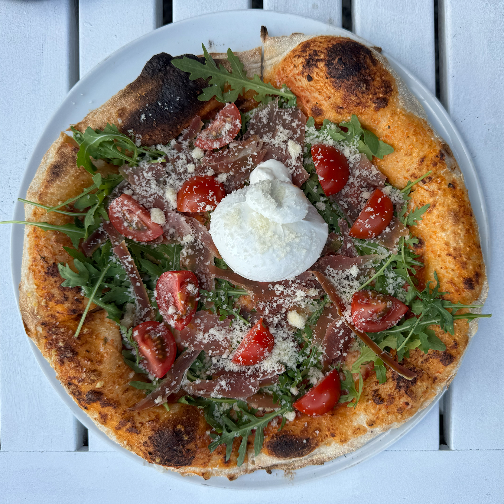 Gramaje: Sos roșii 80g, Fior di latte 80g, Burrata 60g, Prosciutto crudo 45g, Rucola 10g, Parmezan 10g, Ulei EVO 5g